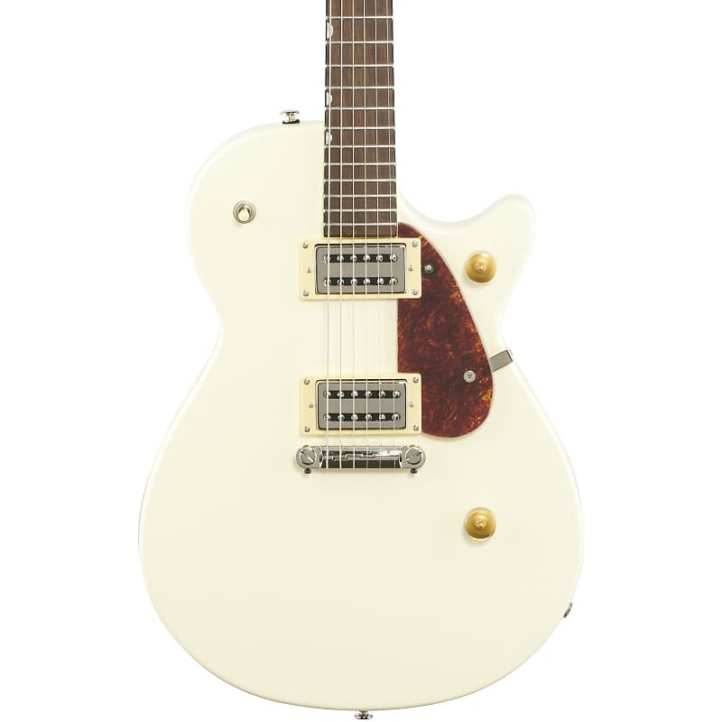 Dressed in stylish finishes including Golddust, Gunmetal, Imperial Stain and Vintage White, the G2210 also features an anchored compensated wrap-around bridge, synthetic bone nut, bound neck, vintage-style control knobs, tortoise pickguard and nickel hardware.